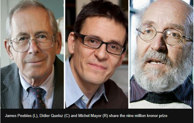 James Peebles, Michel Mayor and Didier Queloz were announced as this year’s winners at a ceremony in Stockholm.